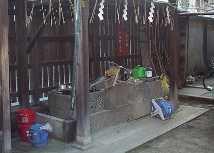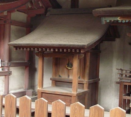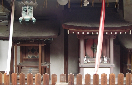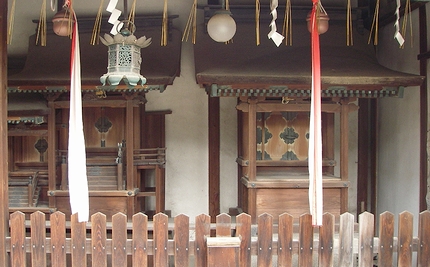 一番右は三寶大荒神。竃神社として、歳神・澳津彦命・澳津姫命を祀る。 次は天満宮。天満神道真尊を祀る。 次に淡嶋社。少彦吊太神を祀る。一番左は春日社。天津児屋根命・天大玉命を祀る。 | ![]() |