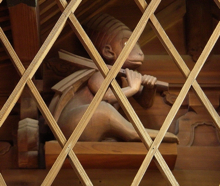 | 本殿東側の破風に在する猿。御所猿が辻の猿とともに鬼門を睨む。 | ![]() |