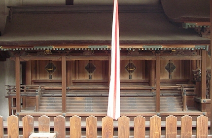 | 拝所。おびただしい数の絵馬がかかる。恋の祈願や、縁結びの祈願が多い。一間社流造の本殿は覆屋で見えない。 | ![]() |